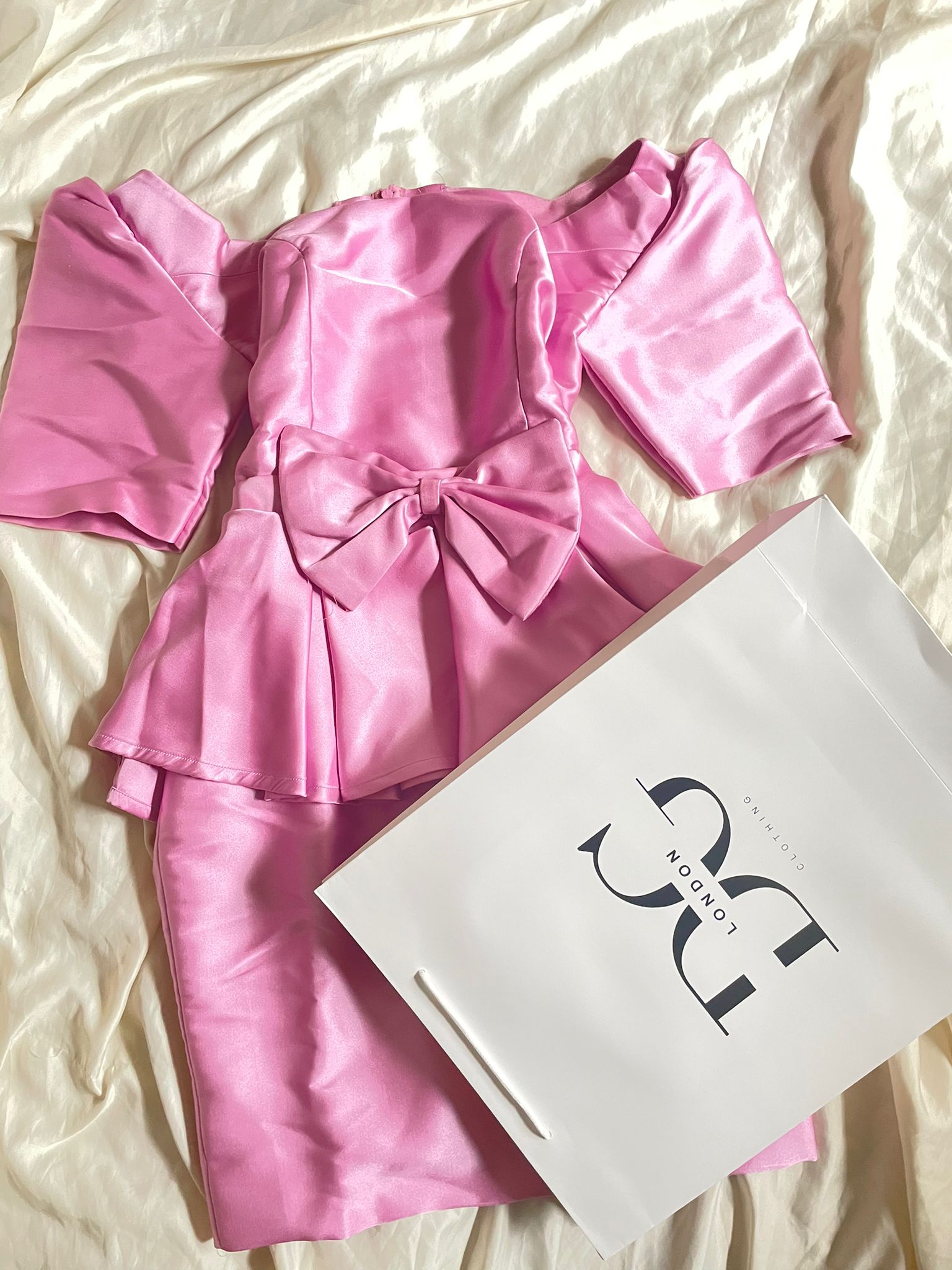 Designed in a delicate blush-pink hue, this statement piece features our signature oversized bow detail, creating a sophisticated silhouette that flatters from every angle. Crafted from premium, soft-touch fabric, it drapes beautifully and moves with you — the epitome of modern glamour.